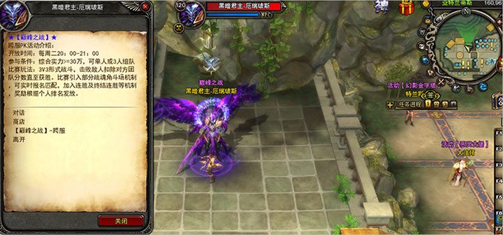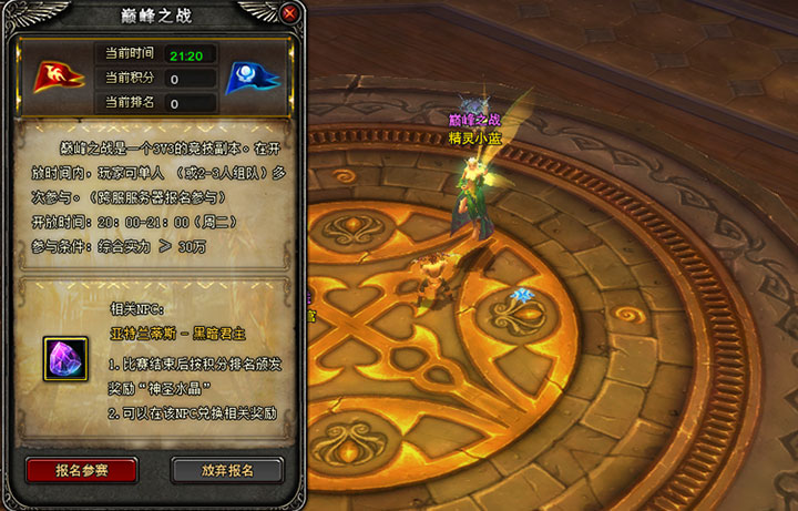 活动时间:每周二20:00-21:00 参与方式: 1、跨服传送NPC:亚特兰蒂斯黑暗君主(坐标160,96) 2、跨服报名NPC:跨服战场大厅 精灵小蓝 参与条件: 非化身历史最高实力≥30万 单人或组队报名(支持跨区组队,与其它服务器玩家联手作战)