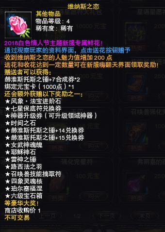 3月16日到3月23日23:59在期间,“众神宝藏”购买新服特殊玫瑰“维纳斯之恋”赠送给心仪之人,不仅每次赠送都有机会获得好礼,送花和收花达到一定数量还可以领取神级战斗坐骑兑换券、赫淮斯托斯升级符等稀有道具,更有机会获得绝版人气召唤兽【战争雅典娜】和新服专属7星出战召唤兽【爱神-维纳斯】、7星化身召唤兽【恋神-艾洛斯】。