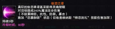 依恋之诺:对目标造成240%物理(或魔法)攻击的伤害(不结算神防、抗性、防御、暴击),施加“恋慕枷锁”状态(召唤兽维纳斯“神恋洗礼”技能伤害加深),持续5秒
