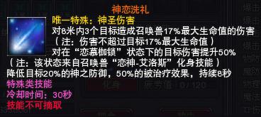 神恋洗礼:唯一特殊:神圣伤害 对8米内3个目标造成召唤兽17%最大生命值的伤害(注:伤害不超过目标17%最大生命值),对在“恋慕枷锁”状态下的目标伤害提升50%(注:该状态来自召唤兽“恋神-艾洛斯”化身技能),降低目标20%神之防御、50%被治疗效果,持续8秒