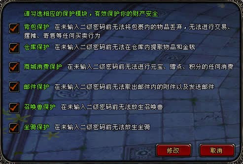 在保护设置界面勾选个人所需要的保护内容,勾选完成后点击【修改】按钮完成设置,并返回设置菜单。