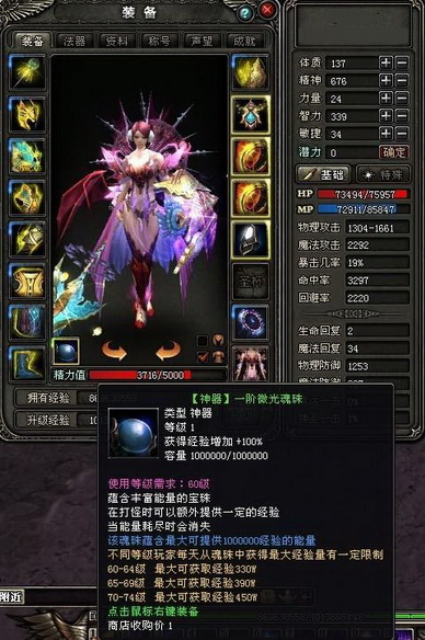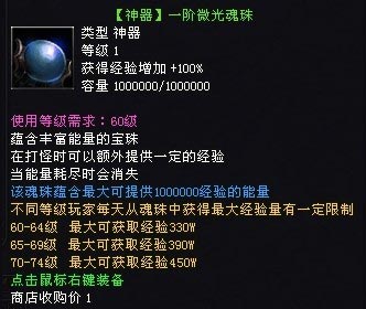 通过装备“魂珠”,人物装备属性界面将焕然一新!除此之外,全新“魂珠”不仅能让你在挂机打怪期间获得原有经验值,更能额外吸收击杀怪物经验值,在无形之中提升你的冲级速度!每天,玩家使用“魂珠”的数量不受限制,但不同等级的玩家通过“魂珠”获得的经验却有上限。当达到该上限后,将无法从“魂珠”内提取经验。