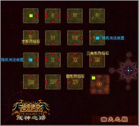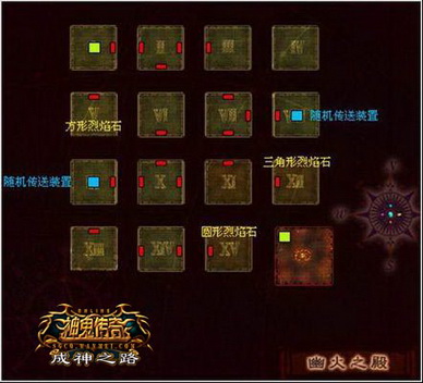 传送前往特殊房间的传送机关在“I”号房间,使用该机关需要找到三样零件“方形烈焰石”、“圆形烈焰石”和“三角形烈焰石”。在幽火之殿中,9号房间和8号房间内分别有一个随机传送装置,每触发传送一次需要消耗5颗能量晶石,能量晶石可以通过击杀幽暗之殿内的怪物几率获得。
