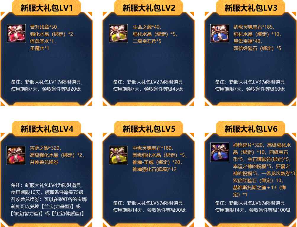 活动内容:活动期间,角色到达相应等级可在活动页面领取新服大礼包,开启大礼包可获得相应奖励;