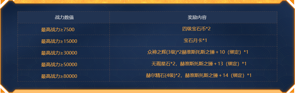 活动内容:活动期间,战力达到指定要求可以领取相应奖励,具体奖励内容如下: