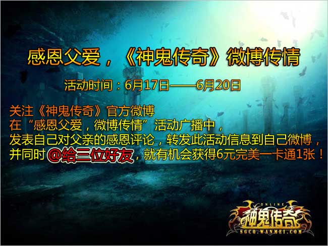 关注《神鬼传奇》官方微博,在“感恩父爱,微博传情”活动广播中,发表自己对父亲的感恩评论,转发此活动信息到自己微博,并同时@给三位好友,就有机会获得6元完美一卡通1张!