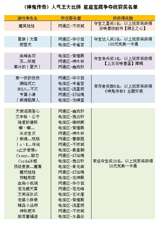 《神鬼传奇》星座宝藏争夺战获奖名单: