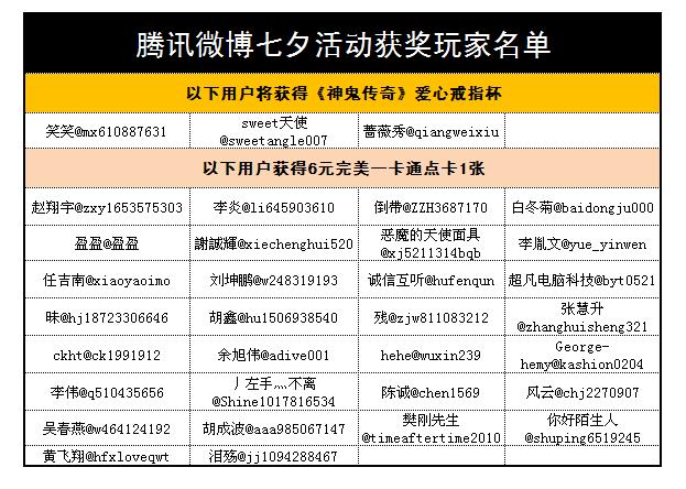 《神鬼传奇》七夕活动,腾讯微博获奖玩家名单