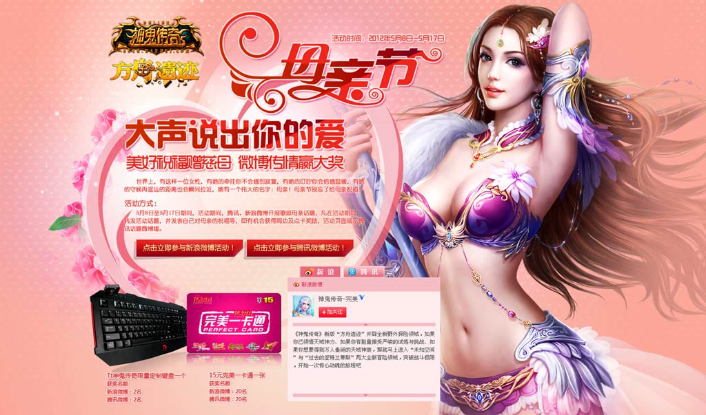 浓情5月,感恩母亲,赢取点卡,2012年母亲节《神鬼传奇》与你一起陪妈妈过节!即刻行动,去微博大声喊出你的爱吧!你送祝福,我们为你送大奖!