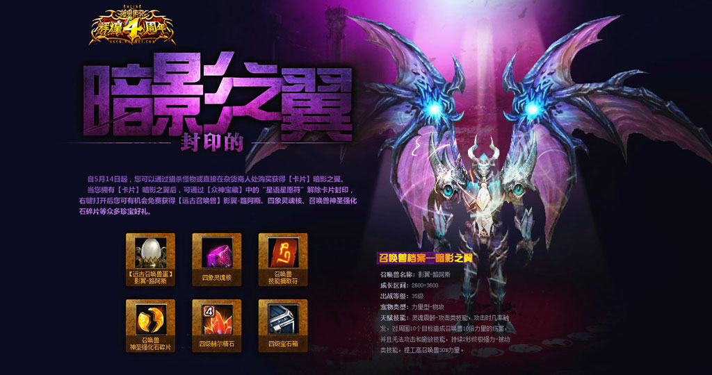 即日起,《神鬼传奇》全新卡片“暗影之翼”重现魔幻大陆,五星半的战宠影翼-路阿斯携天赋神技“灵魂震颤”霸气降临,更有四象灵魂核、召唤兽神圣强化石碎片等多重珍宝等你免费拥有。现在就到莫提尼亚的野外去猎杀怪物,从杂货商人手中购买卡片“暗影之翼”,并通过“众神宝藏”中的“星语星愿符”解除卡片封印,打开被时光尘封的重宝吧!