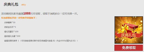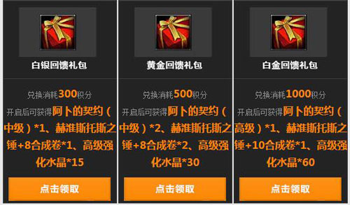 活动期间消耗累计积分还可兑换白银回馈礼包、黄金回馈礼包及白金回馈礼包。根据礼包不同,玩家将可获得不同等级或数量的阿卜的契约、赫淮斯托斯之锤等稀有道具。阿卜的契约更可兑换到召唤兽技能、神级召唤兽复活卷等超值惊喜奖励!